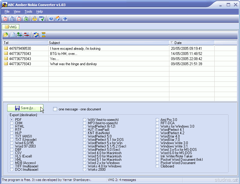 Nástroj umožňujúci ľahký prevod VMG súborov na dokumenty radu rôznych formátov (PDF, MS Word, HTML, RTF, TXT a pod.