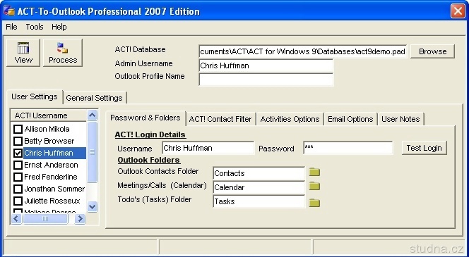 Parametre programu ACT-To-Outlook Professional - 2007 9.1
