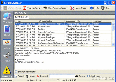 Program umožňuje zaznamenávať všetky klávesy stlačené užívateľom.