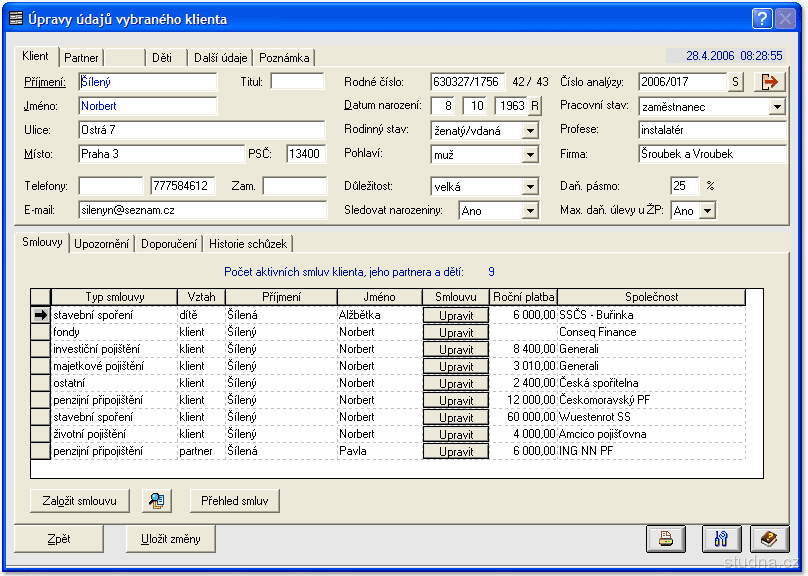 Program Alex® zaisťuje evidenciu Kontaktov, Klientov, Zmlúv, Provízií, Upozornení (úloh), Narodenín, Produktov, Poskytovateľov.