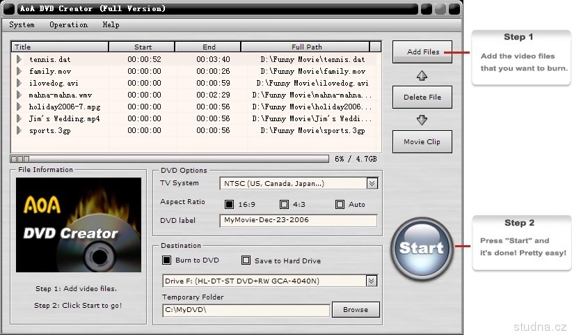 AoA DVD Creator umožňuje jednoduchú konverziu a vypálenie vášho videa rôzneho formátu (AVI/DivX/XviD, WMV/ASF, MP4, FLV, 3GP, MPEG-1/MPEG-2, DAT a MOV) na DVD.