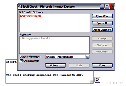 ASP SpellCheck je komponent pre kontrolu pravopisu vo vašich ASP (VBScript) webových aplikáciách (W3C HTML a XHTML).