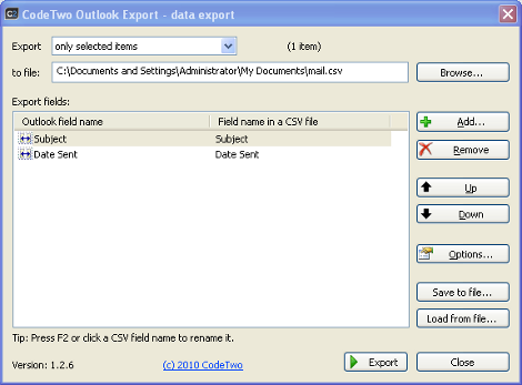 Parametre programu CodeTwo Outlook Export 1.2.8