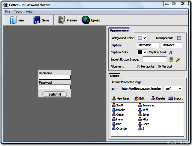 Nástroj pre tvorbu webových stránok chránených užívateľskými menami a heslami, bez znalosti Java alebo HTML.