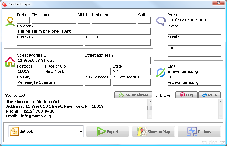 ContactCopy umožňuje jednoduché vkladanie kontaktných informácií z rôznych dokumentov alebo webových stránok do aplikácií Outlook, Excel, Microsoft Dynamics CRM, Lotus Notes alebo Palm Desktop.