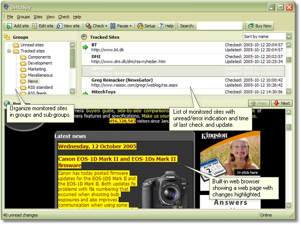 DeltaSpy automaticky monitoruje obsah zvolených webových stránok a upozorní vás, pokiaľ sa obsah stránok alebo blogov zmení.