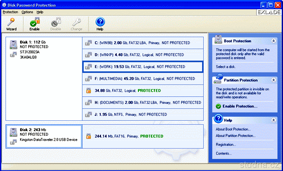 Disk Password Protection umožňuje ochranu diskov a diskových oddielov ich šifrovaním (AES 256-bit).