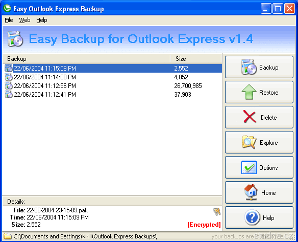 Systém pre jednoduché zálohovanie a obnovu dát poštového klienta Outlook Express: identít, poštových správ, nastavenie poštových účtov, pravidiel pre spracovanie správ, adresára, zoznamu blokovaných odosielateľov pošty, podpisov.