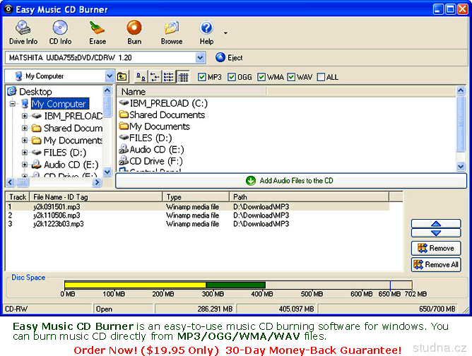 Easy Music CD Burner umožňuje jednoduchú tvorbu zvukových CD priamo z MP3/OGG/WMA/WAV súborov.