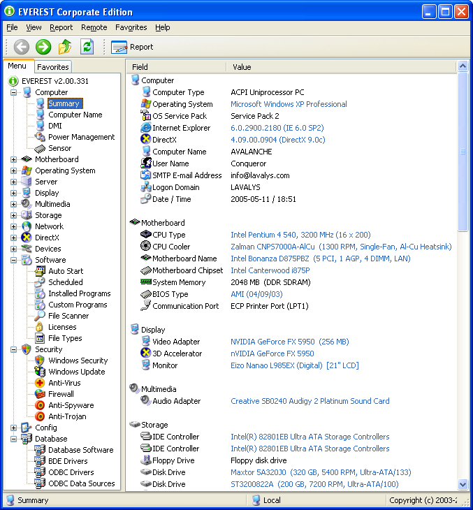 Parametre programu EVEREST Corporate Edition 5.50 Build 2100