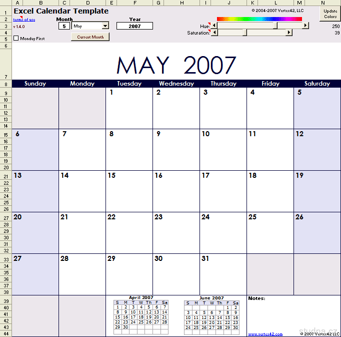 Šablóna pre Microsoft Excel XP/2003/2007, umožňujúca ľahko vytvoriť a vytlačiť kalendár na každý mesiac alebo na celý rok (2007 – 2010).