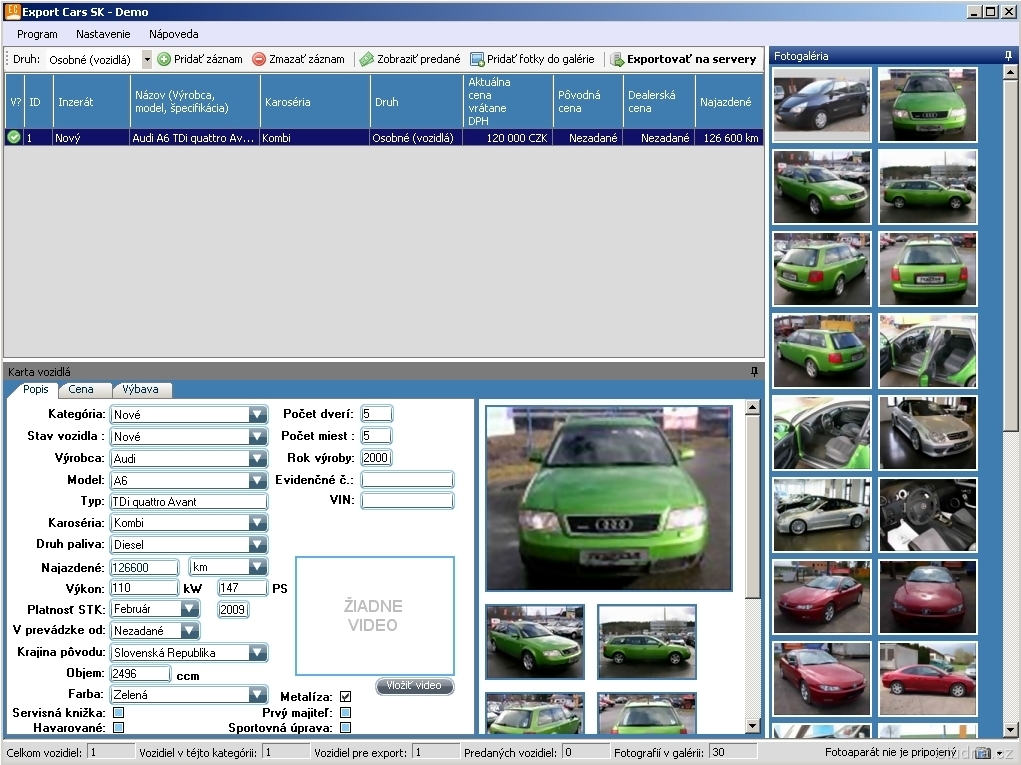 Parametre programu Export Cars SK 1.1