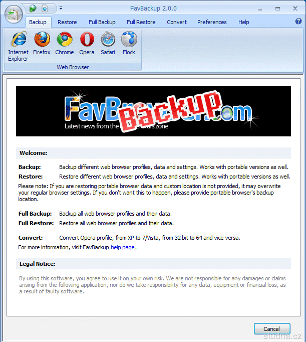 FavBackup umožňuje jednoduché zálohovanie a obnovu všetkých nastavení vášho internetového prehliadača, vrátane obľúbených položiek, histórie, poskytovateľov vyhľadávania, cookies, formulárových dát, panelov nástrojov a pod.