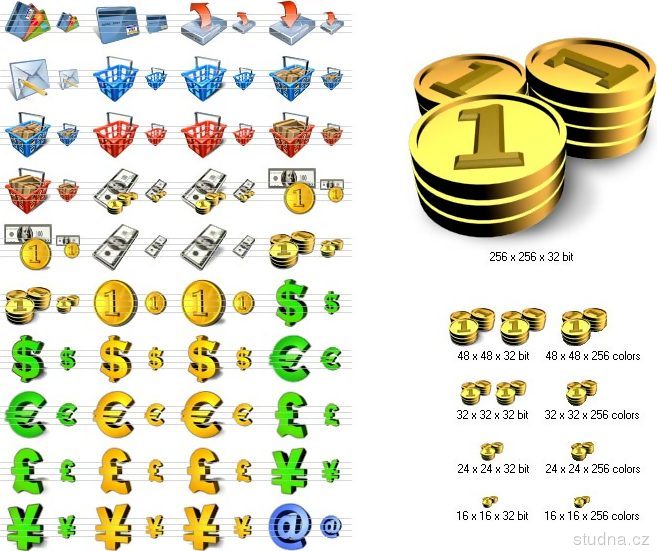 Súprava atraktívnych, moderných ikon z oblasti financií a transportu vo Windows XP a 8-bitovom farebnom formáte, v rozmeroch 16x16, 24x24, 32x32, 48x48 a 256x256.