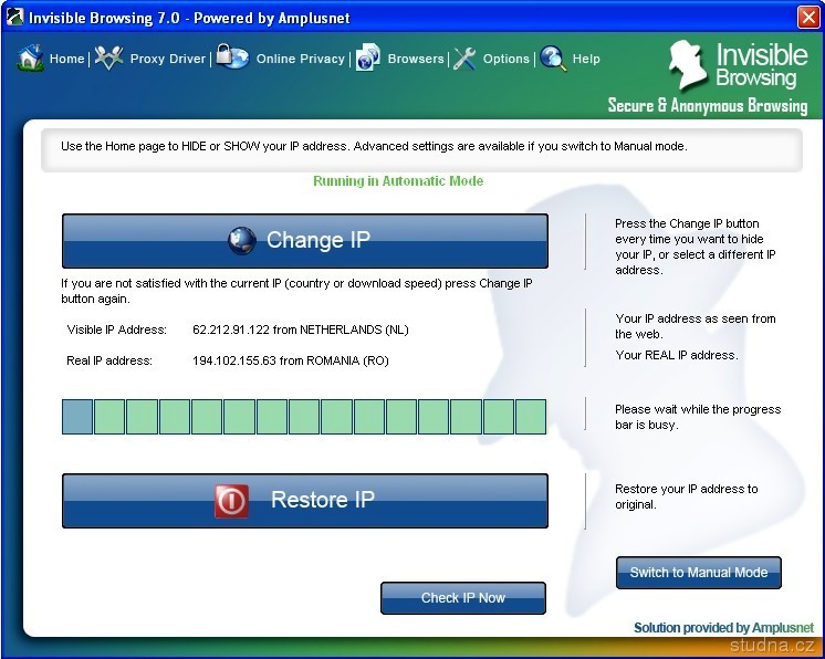 Invisible Browsing umožňuje zmeniť alebo maskovať vašu IP adresu routovaním internetovej komunikácie cez anonymné proxy servery a zaistiť tak vašu anonymitu pri prezeraní webových stránok.