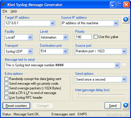 Parametre programu Kiwi Syslog Generator 2.1