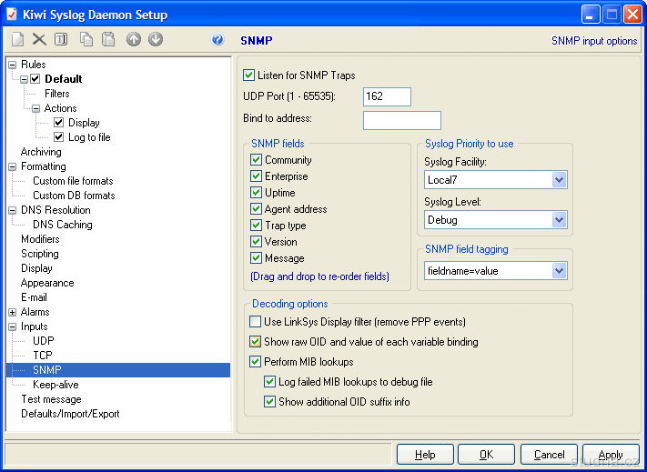 Parametre programu Kiwi's Syslog Daemon 8.2.5