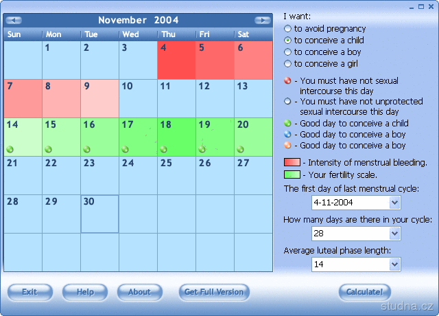 Nástroj umožňujúci na základe menštruačných cyklov vypočítať dni, kedy má žena najväčšiu pravdepodobnosť otehotnieť.