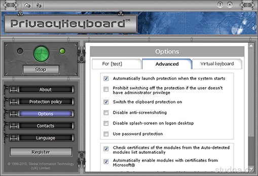 PrivacyKeyboard chráni pred všetkými typmi programov a hardvérových zariadení, ktoré zaznamenávajú stlačenia klávesov (keyloggery).