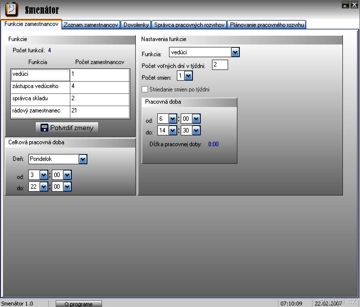 Program Zmenátor je jeden z mála programov, ktorý dokáže rýchlo a prehľadne naplánovať pracovný rozvrh pre určený počet zamestnancov s danými funkciami.