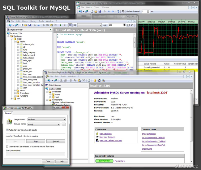 Sada nástrojov pre ľahký vývoj databáz, správu serverov, spracovanie a export dát: Database Explorer pre MySQL, Query Builder pre MySQL, Activity Watcher pre MySQL, Service Manager pre MySQL.
