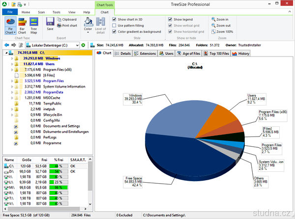 TreeSize Professional prehľadne zobrazí veľkosť zložiek a súborov na disku, počet súborov, NTFS kompresiu a ďalšie údaje.