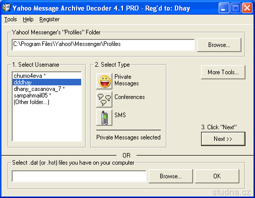 Parametre programu Yahoo Message Archive Decoder 4.5